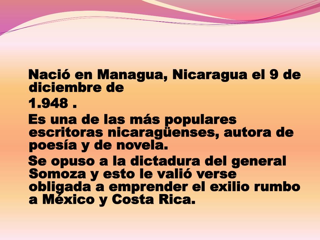 Nació en Managua, Nicaragua el 9 de diciembre de 1.948 . Es una de las más populares escritoras nicaragüenses, autora de poesía y de novela. Se opuso a la dictadura del general Somoza y esto le valió verse obligada a emprender el exilio rumbo a México y Costa Rica.