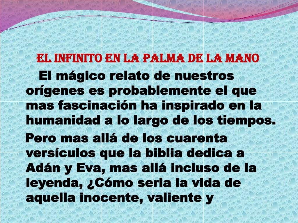 El infinito en la palma de la mano El mágico relato de nuestros orígenes es probablemente el que mas fascinación ha inspirado en la humanidad a lo largo de los tiempos. Pero mas allá de los cuarenta versículos que la biblia dedica a Adán y Eva, mas allá incluso de la leyenda, ¿Cómo seria la vida de aquella inocente, valiente y