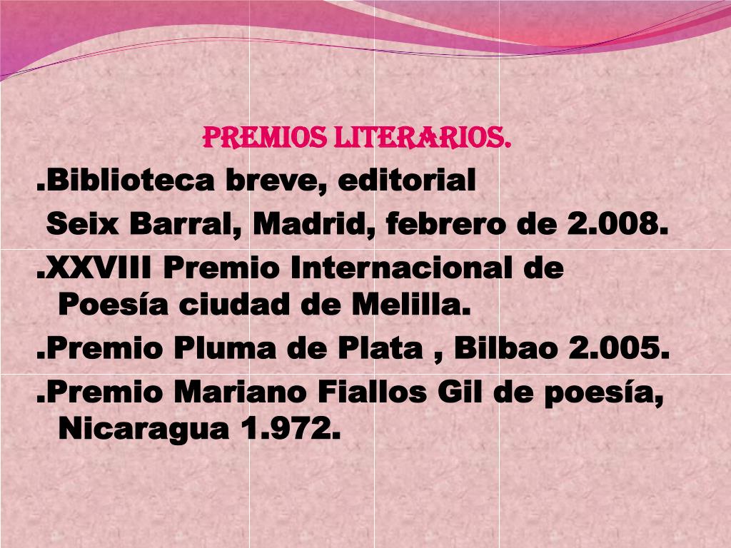 PREMIOS LITERARIOS. .Biblioteca breve, editorial Seix Barral, Madrid, febrero de 2.008. .XXVIII Premio Internacional de Poesía ciudad de Melilla. .Premio Pluma de Plata , Bilbao 2.005. .Premio Mariano Fiallos Gil de poesía, Nicaragua 1.972.