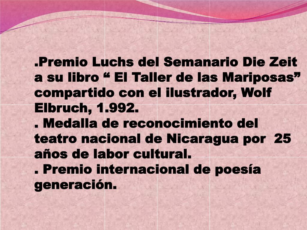 .Premio Luchs del Semanario Die Zeit a su libro “ El Taller de las Mariposas” compartido con el ilustrador, Wolf Elbruch, 1.992. . Medalla de reconocimiento del teatro nacional de Nicaragua por 25 años de labor cultural. . Premio internacional de poesía generación.