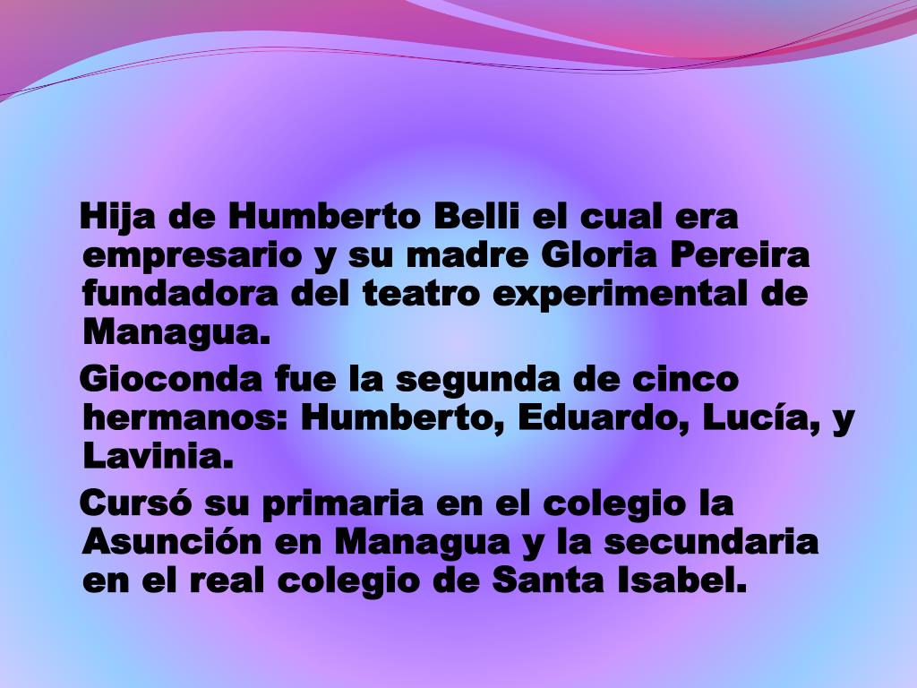 Hija de Humberto Belli el cual era empresario y su madre Gloria Pereira fundadora del teatro experimental de Managua. Gioconda fue la segunda de cinco hermanos: Humberto, Eduardo, Lucía, y Lavinia. Cursó su primaria en el colegio la Asunción en Managua y la secundaria en el real colegio de Santa Isabel.