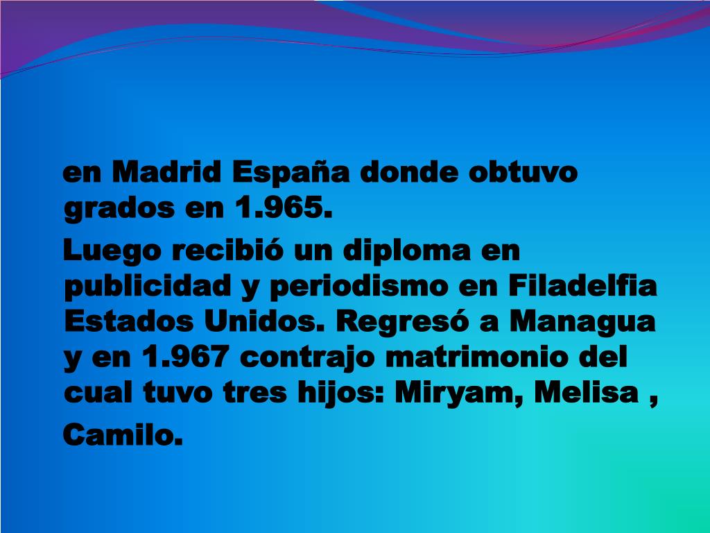 en Madrid España donde obtuvo grados en 1.965. Luego recibió un diploma en publicidad y periodismo en Filadelfia Estados Unidos. Regresó a Managua y en 1.967 contrajo matrimonio del cual tuvo tres hijos: Miryam, Melisa , Camilo.