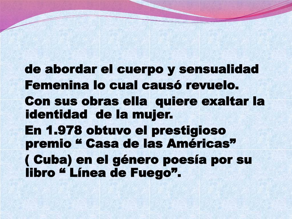 de abordar el cuerpo y sensualidad Femenina lo cual causó revuelo. Con sus obras ella quiere exaltar la identidad de la mujer. En 1.978 obtuvo el prestigioso premio “ Casa de las Américas” ( Cuba) en el género poesía por su libro “ Línea de Fuego”.