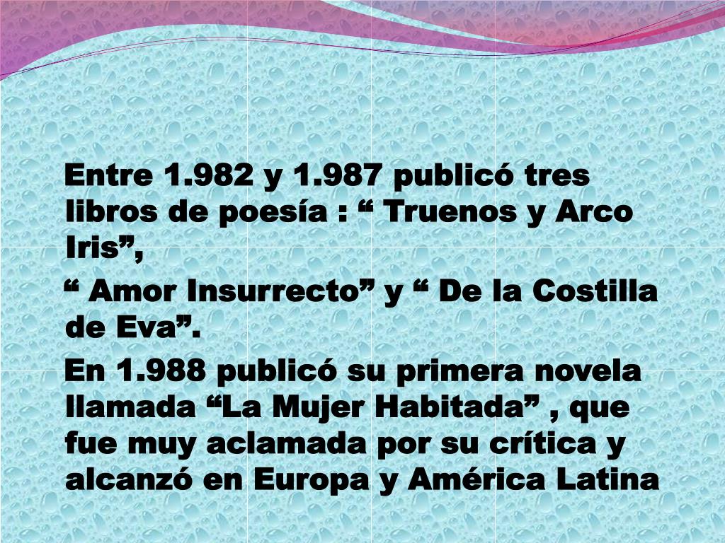 Entre 1.982 y 1.987 publicó tres libros de poesía : “ Truenos y Arco Iris”, “ Amor Insurrecto” y “ De la Costilla de Eva”. En 1.988 publicó su primera novela llamada “La Mujer Habitada” , que fue muy aclamada por su crítica y alcanzó en Europa y América Latina