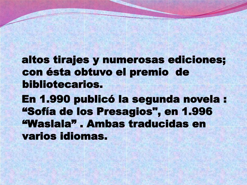 altos tirajes y numerosas ediciones; con ésta obtuvo el premio de bibliotecarios. En 1.990 publicó la segunda novela : “Sofía de los Presagios", en 1.996 “Waslala” . Ambas traducidas en varios idiomas.