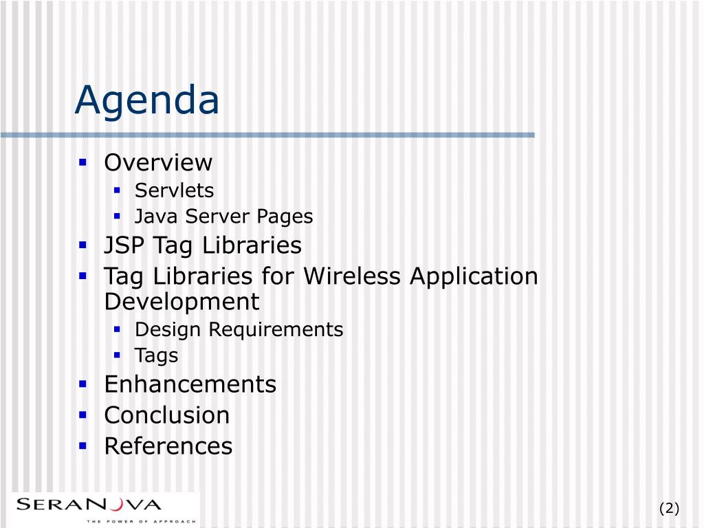 Agenda • Overview • Servlets • Java Server Pages • JSP Tag Libraries • Tag Libraries for Wireless Application Development • Design Requirements • Tags • Enhancements • Conclusion • References