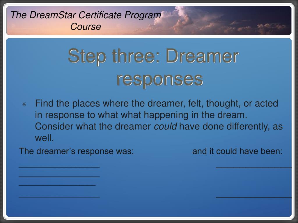 The DreamStar Certificate Program Course Step three: Dreamer responses • This is what I came up with: The dreamer’s response was: and it could have been: acting powerlessactingconfrontive and inquiring driving to the country confronting the intruder attacking the young mantalking to the young man subduing the dog allowing the dog to stay