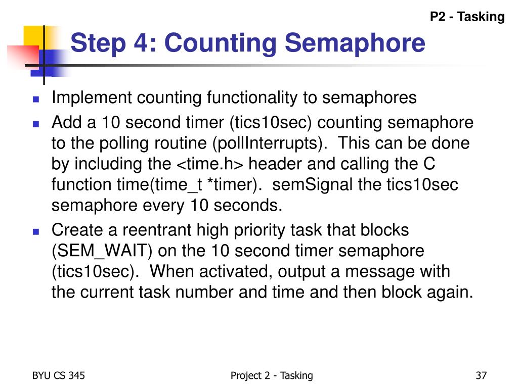 P2 - Tasking Step 4: Counting Semaphore • Implement counting functionality to semaphores • Add a 10 second timer (tics10sec) counting semaphore to the polling routine (pollInterrupts). This can be done by including the <time.h> header and calling the C function time(time_t *timer). semSignal the tics10sec semaphore every 10 seconds. • Create a reentrant high priority task that blocks (SEM_WAIT) on the 10 second timer semaphore (tics10sec). When activated, output a message with the current task number and time and then block again. Project 2 - Tasking