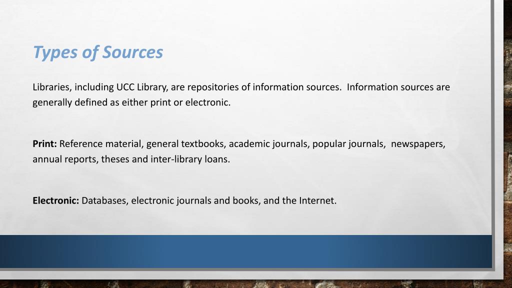 Types of Sources Libraries, including UCC Library, are repositories of information sources. Information sources are generally defined as either print or electronic. Print: Reference material, general textbooks, academic journals, popular journals, newspapers, annual reports, theses and inter-library loans. Electronic: Databases, electronic journals and books, and the Internet.