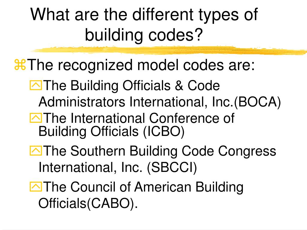 What are the different types of building codes? • The recognized model codes are: • The Building Officials & Code Administrators International, Inc.(BOCA) • The International Conference of Building Officials (ICBO) • The Southern Building Code Congress International, Inc. (SBCCI) • The Council of American Building Officials(CABO).