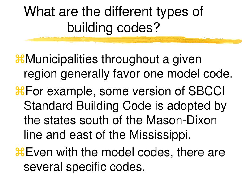 What are the different types of building codes? • Municipalities throughout a given region generally favor one model code. • For example, some version of SBCCI Standard Building Code is adopted by the states south of the Mason-Dixon line and east of the Mississippi. • Even with the model codes, there are several specific codes.