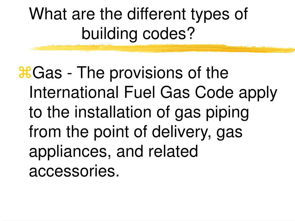 What are the different types of building codes? • Gas - The provisions of the International Fuel Gas Code apply to the installation of gas piping from the point of delivery, gas appliances, and related accessories.