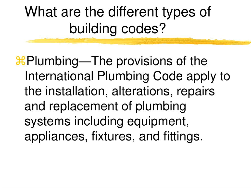 What are the different types of building codes? • Plumbing—The provisions of the International Plumbing Code apply to the installation, alterations, repairs and replacement of plumbing systems including equipment, appliances, fixtures, and fittings.