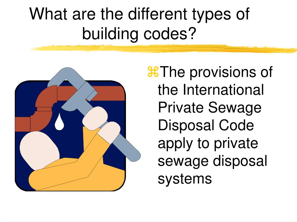 What are the different types of building codes? • The provisions of the International Private Sewage Disposal Code apply to private sewage disposal systems