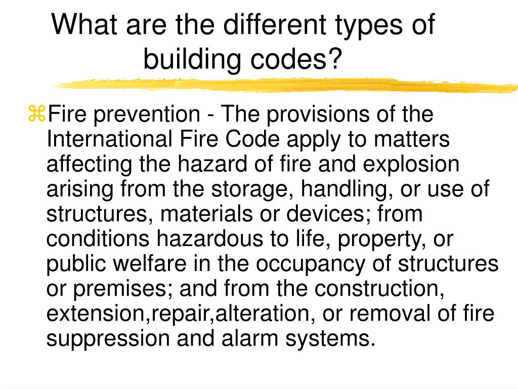 What are the different types of building codes? • Fire prevention - The provisions of the International Fire Code apply to matters affecting the hazard of fire and explosion arising from the storage, handling, or use of structures, materials or devices; from conditions hazardous to life, property, or public welfare in the occupancy of structures or premises; and from the construction, extension,repair,alteration, or removal of fire suppression and alarm systems.