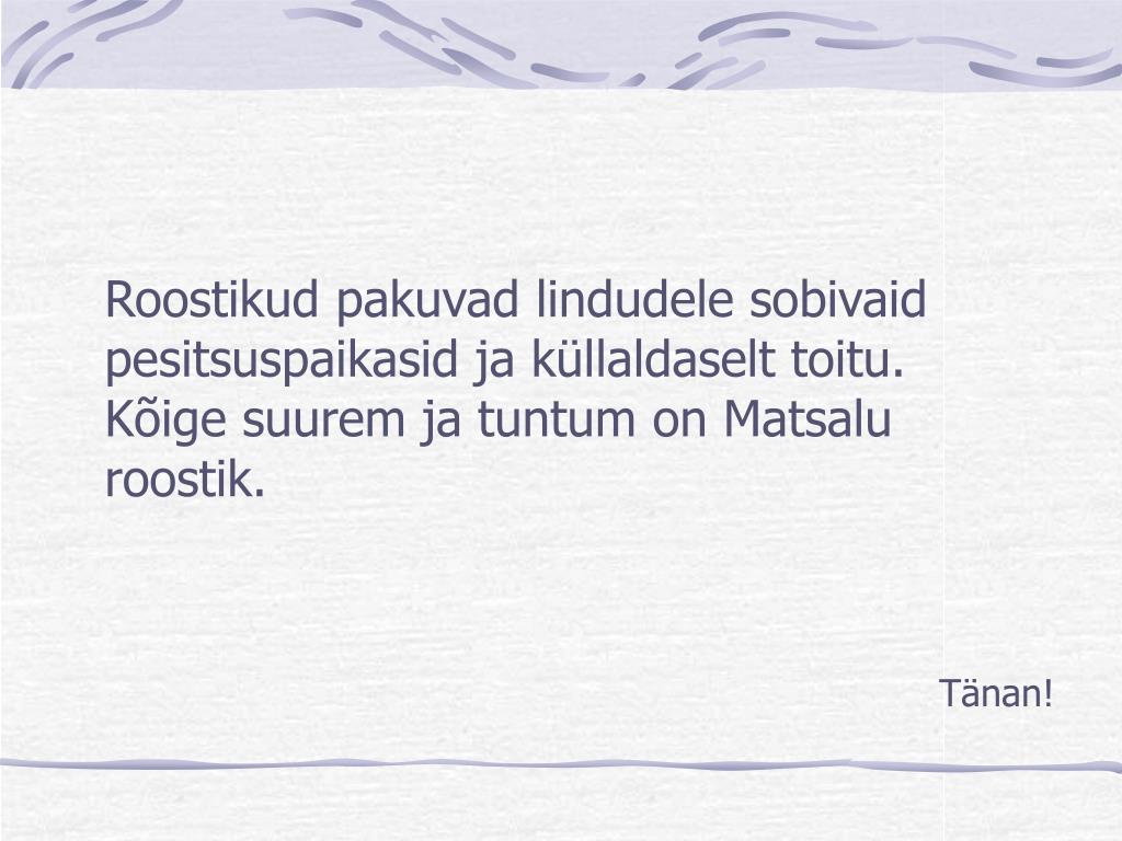Roostikud pakuvad lindudele sobivaid pesitsuspaikasid ja küllaldaselt toitu. Kõige suurem ja tuntum on Matsalu roostik. Tänan!