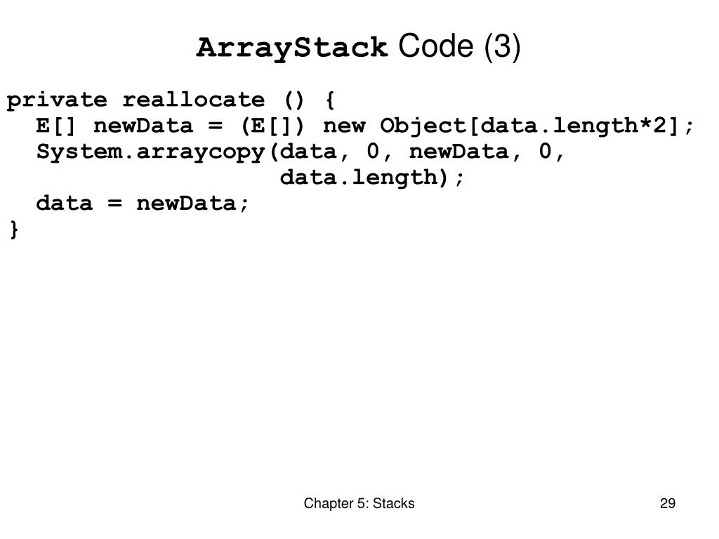 ArrayStack Code (3) private reallocate () { E[] newData = (E[]) new Object[data.length*2]; System.arraycopy(data, 0, newData, 0, data.length); data = newData; } Chapter 5: Stacks
