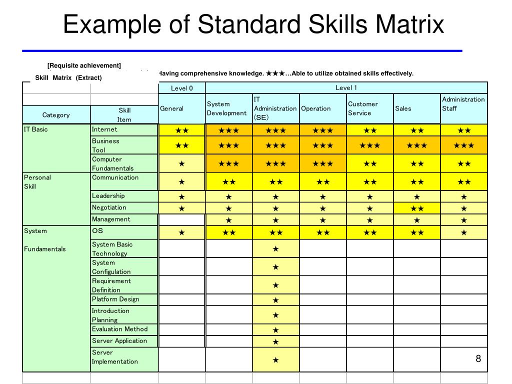 Example of Standard Skills Matrix [Requisite achievement] ★…Having basic knowledge. ★★…Having comprehensive knowledge. ★★★…Able to utilize obtained skills effectively. SkillMatrix(Extract)
