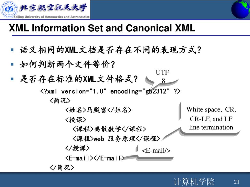 XML Information Set and Canonical XML • 语义相同的XML文档是否存在不同的表现方式? • 如何判断两个文件等价? • 是否存在标准的XML文件格式? UTF-8 <?xml version="1.0" encoding="gb2312" ?> <简况> <姓名>马殿富</姓名> <授课> <课程>离散数学</课程> <课程>web 服务原理</课程> </授课> <E-mail></E-mail> </简况> White space,CR, CR-LF, and LF line termination <E-mail/>