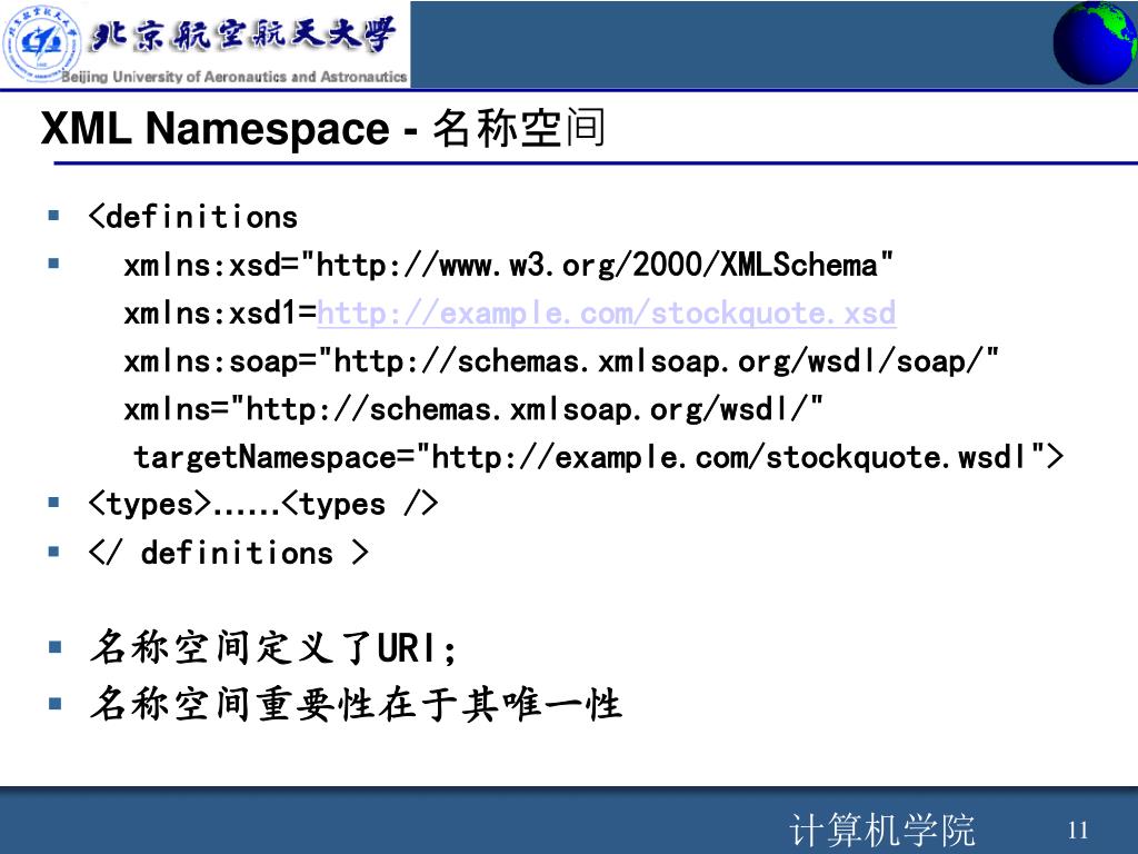 XML Namespace - 名称空间 • <definitions • xmlns:xsd="http://www.w3.org/2000/XMLSchema" • xmlns:xsd1=http://example.com/stockquote.xsd • xmlns:soap="http://schemas.xmlsoap.org/wsdl/soap/" • xmlns="http://schemas.xmlsoap.org/wsdl/" targetNamespace="http://example.com/stockquote.wsdl"> • <types>……<types /> • </ definitions > • 名称空间定义了URI; • 名称空间重要性在于其唯一性
