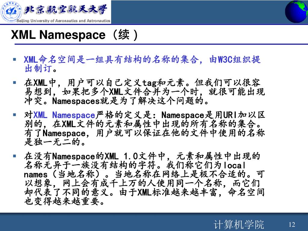 XML Namespace(续) • XML命名空间是一组具有结构的名称的集合,由W3C组织提出制订。 • 在XML中,用户可以自己定义tag和元素。但我们可以很容易想到,如果把多个XML文件合并为一个时,就很可能出现冲突。Namespaces就是为了解决这个问题的。 • 对XML Namespace严格的定义是:Namespace是用URI加以区别的,在XML文件的元素和属性中出现的所有名称的集合。有了Namespace,用户就可以保证在他的文件中使用的名称是独一无二的。 • 在没有Namespace的XML 1.0文件中,元素和属性中出现的名称无异于一族没有结构的字符。我们称它们为local names(当地名称)。当地名称在网络上是极不合适的。可以想象,网上会有成千上万的人使用同一个名称,而它们却代表了不同的意义。由于XML标准越来越丰富,命名空间也变得越来越重要。