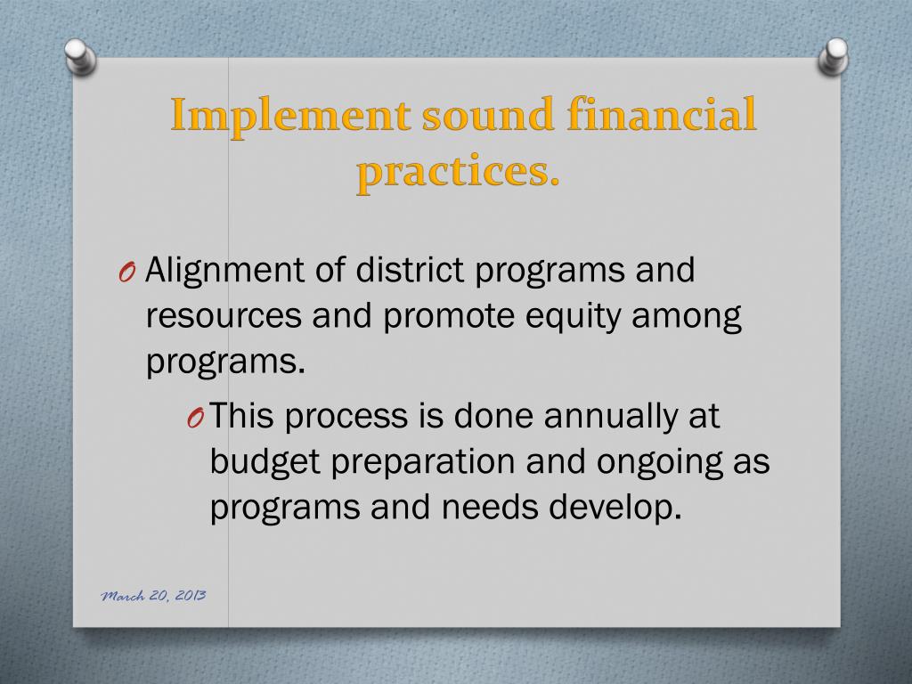 Implement sound financial practices. March 20, 2013 • Alignment of district programs and resources and promote equity among programs. • This process is done annually at budget preparation and ongoing as programs and needs develop.