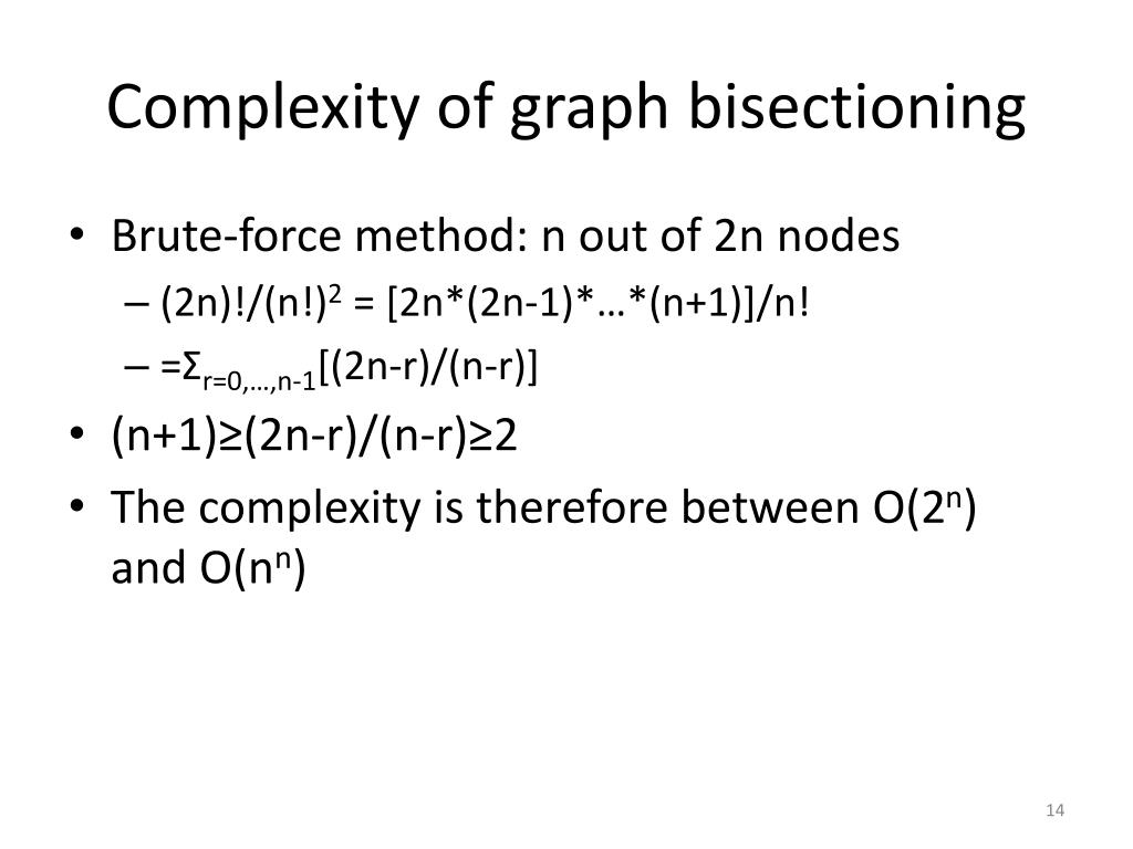 Complexity of graph bisectioning • Brute-force method: n out of 2n nodes • (2n)!/(n!)2= [2n*(2n-1)*…*(n+1)]/n! • =Σr=0,…,n-1[(2n-r)/(n-r)] • (n+1)≥(2n-r)/(n-r)≥2 • The complexity is therefore between O(2n) and O(nn)