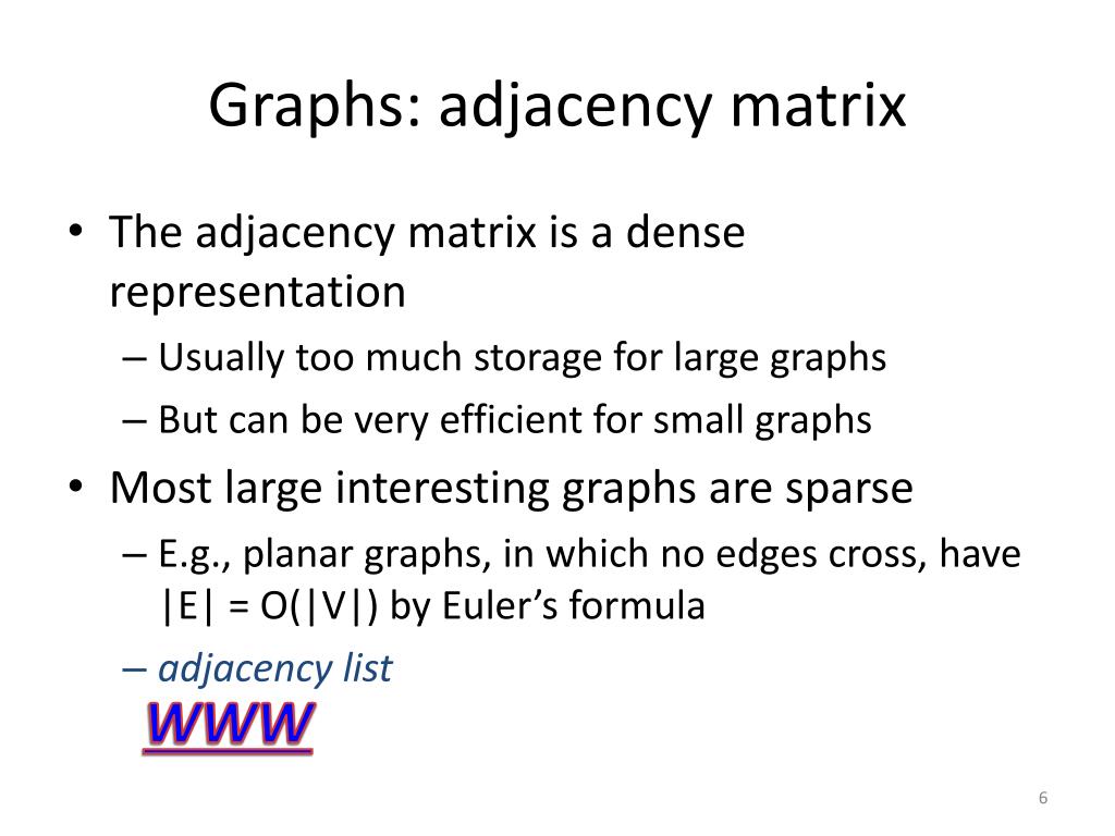 Graphs: adjacency matrix • The adjacency matrix is a dense representation • Usually too much storage for large graphs • But can be very efficient for small graphs • Most large interesting graphs are sparse • E.g., planar graphs, in which no edges cross, have |E| = O(|V|) by Euler’s formula • adjacency list WWW