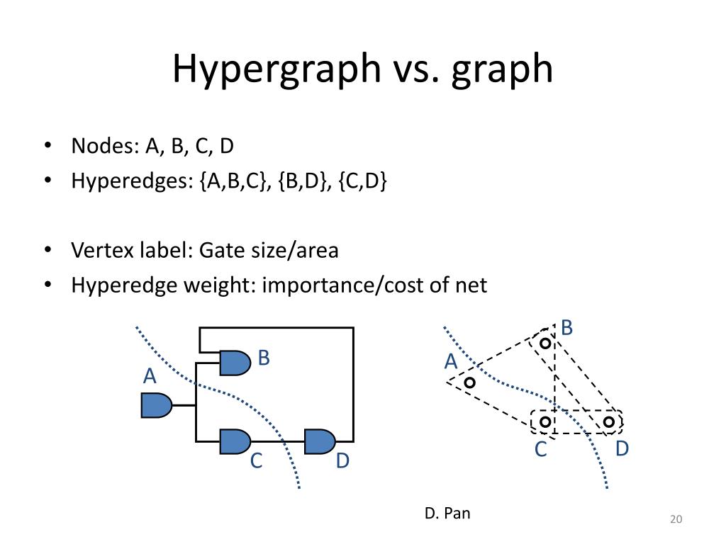 Hypergraph vs. graph • Nodes: A, B, C, D • Hyperedges: {A,B,C}, {B,D}, {C,D} • Vertex label: Gate size/area • Hyperedgeweight: importance/cost of net B B A A D C C D D. Pan