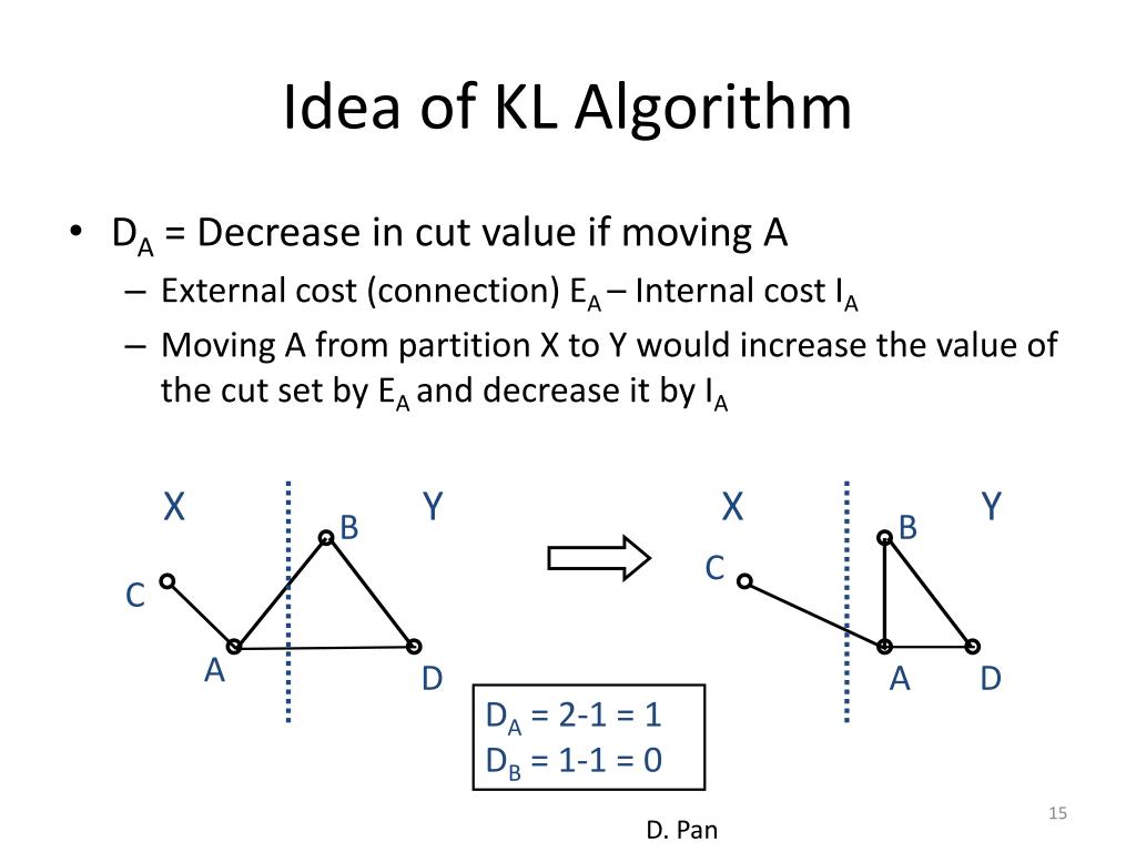 Idea of KL Algorithm • DA = Decrease in cut value if moving A • External cost (connection) EA – Internal cost IA • Moving A from partition X to Y would increase the value of the cut set by EA and decrease it by IA X Y X Y B B C C A D A D DA = 2-1 = 1 DB = 1-1 = 0 D. Pan