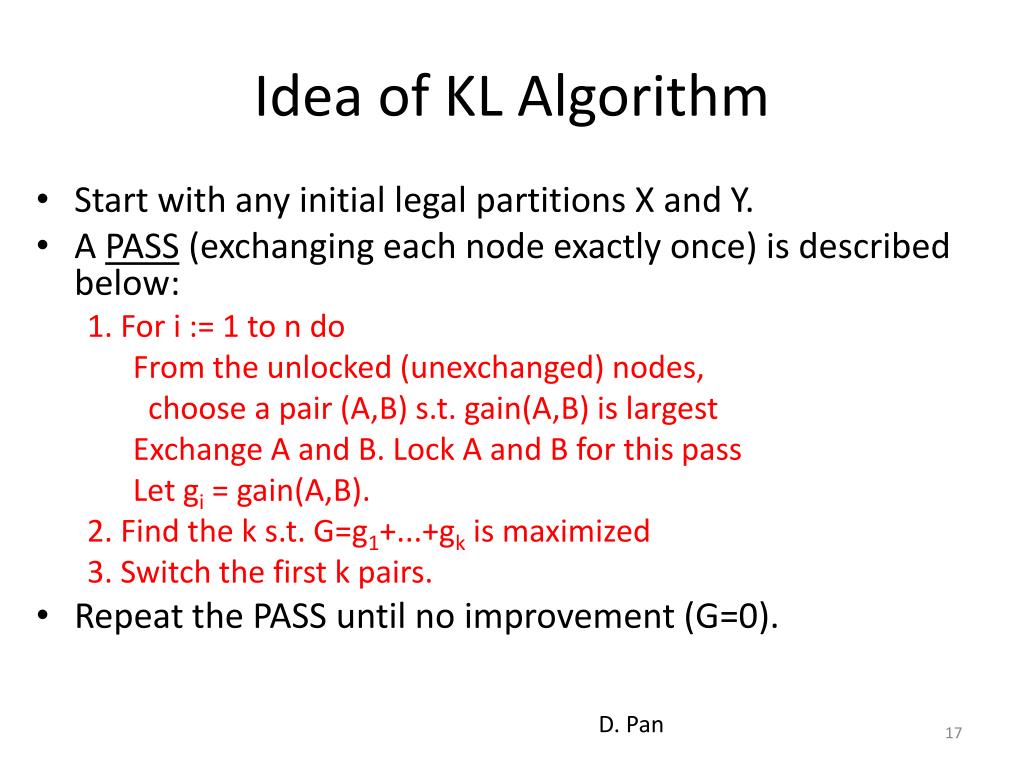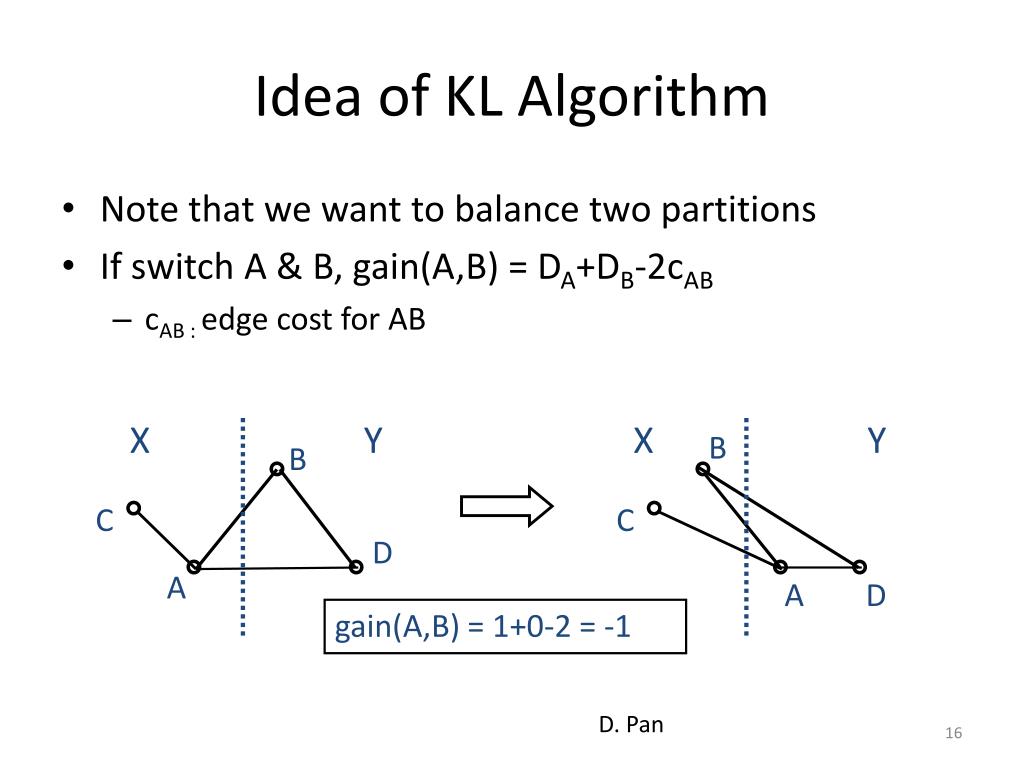 Idea of KL Algorithm • Start with any initial legal partitions X and Y. • A PASS(exchanging each node exactly once) is described below: 1. For i := 1 to n do From the unlocked (unexchanged) nodes, choose a pair (A,B) s.t. gain(A,B) is largest Exchange A and B. Lock A and B for this pass Let gi = gain(A,B). 2. Find the k s.t. G=g1+...+gk is maximized 3. Switch the first k pairs. • Repeat the PASS until no improvement (G=0). D. Pan