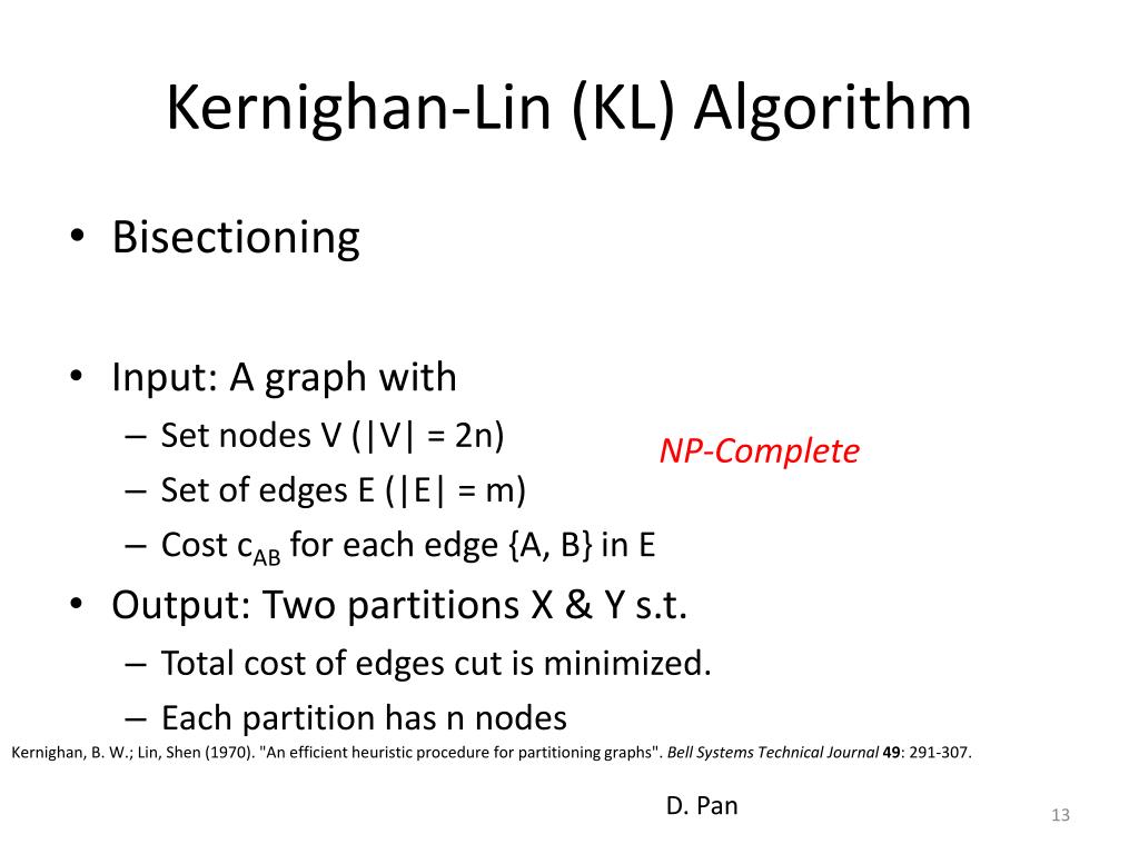 Kernighan-Lin (KL) Algorithm • Bisectioning • Input: A graph with • Set nodes V (|V| = 2n) • Set of edges E (|E| = m) • Cost cAB for each edge {A, B} in E • Output: Two partitions X & Y s.t. • Total cost of edges cut is minimized. • Each partition has n nodes NP-Complete Kernighan, B. W.; Lin, Shen (1970). "An efficient heuristic procedure for partitioning graphs". Bell Systems Technical Journal49: 291-307. D. Pan