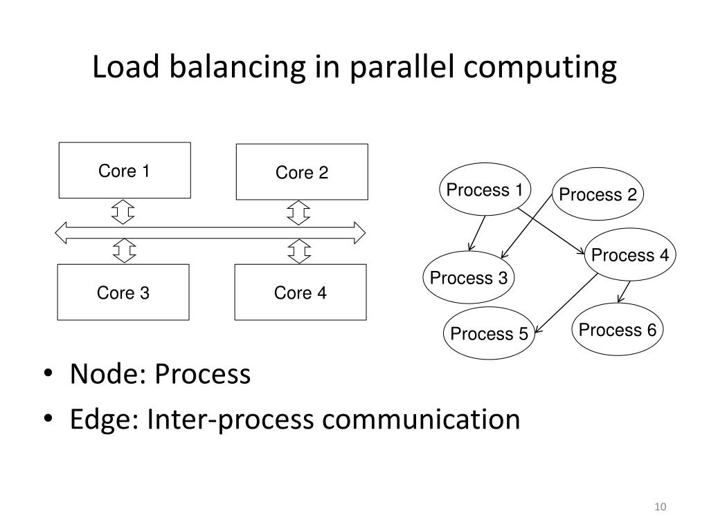 Load balancing in parallel computing • Node: Process • Edge: Inter-process communication Core 1 Core 2 Process 1 Process 2 Process 4 Process 3 Core 3 Core 4 Process 6 Process 5