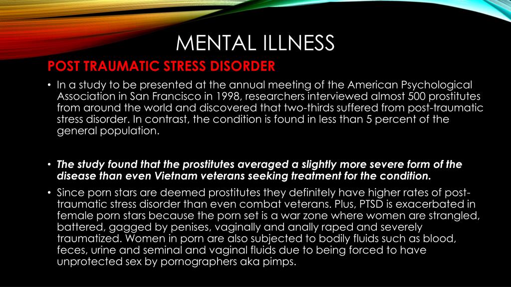 MENTAL ILLNESS POST TRAUMATIC STRESS DISORDER • In a study to be presented at the annual meeting of the American Psychological Association in San Francisco in 1998, researchers interviewed almost 500 prostitutes from around the world and discovered that two-thirds suffered from post-traumatic stress disorder. In contrast, the condition is found in less than 5 percent of the general population. • The study found that the prostitutes averaged a slightly more severe form of the disease than even Vietnam veterans seeking treatment for the condition. • Since porn stars are deemed prostitutes they definitely have higher rates of post-traumatic stress disorder than even combat veterans. Plus, PTSD is exacerbated in female porn stars because the porn set is a war zone where women are strangled, battered, gagged by penises, vaginally and anally raped and severely traumatized. Women in porn are also subjected to bodily fluids such as blood, feces, urine and seminal and vaginal fluids due to being forced to have unprotected sex by pornographers aka pimps.