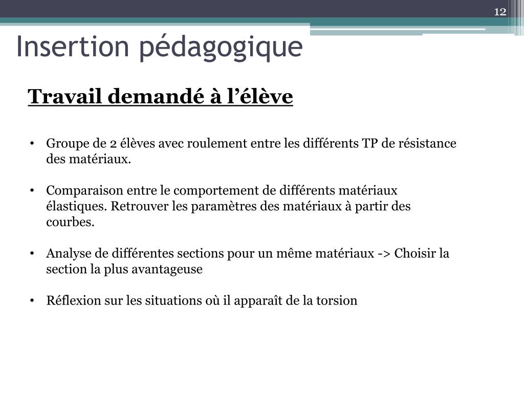 Insertion pédagogique Travail demandé à l’élève • Groupe de 2 élèves avec roulement entre les différents TP de résistance des matériaux. • Comparaison entre le comportement de différents matériaux élastiques. Retrouver les paramètres des matériaux à partir des courbes. • Analyse de différentes sections pour un même matériaux -> Choisir la section la plus avantageuse • Réflexion sur les situations où il apparaît de la torsion