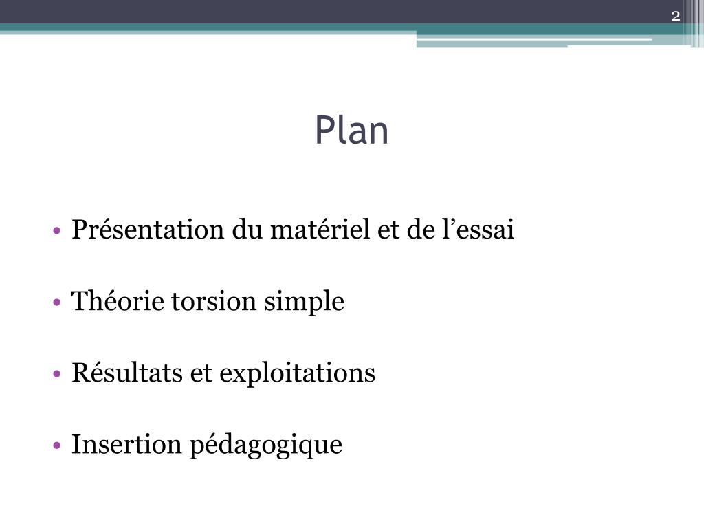 Plan • Présentation du matériel et de l’essai • Théorie torsion simple • Résultats et exploitations • Insertion pédagogique