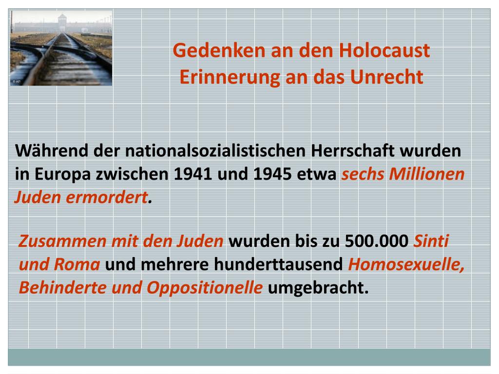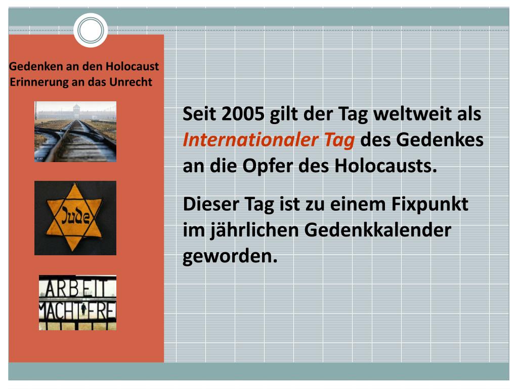 Gedenken an den Holocaust Erinnerung an das Unrecht Seit 2005 gilt der Tag weltweit als Internationaler Tag des Gedenkes an die Opfer des Holocausts. Dieser Tag ist zu einem Fixpunkt im jährlichen Gedenkkalender geworden.