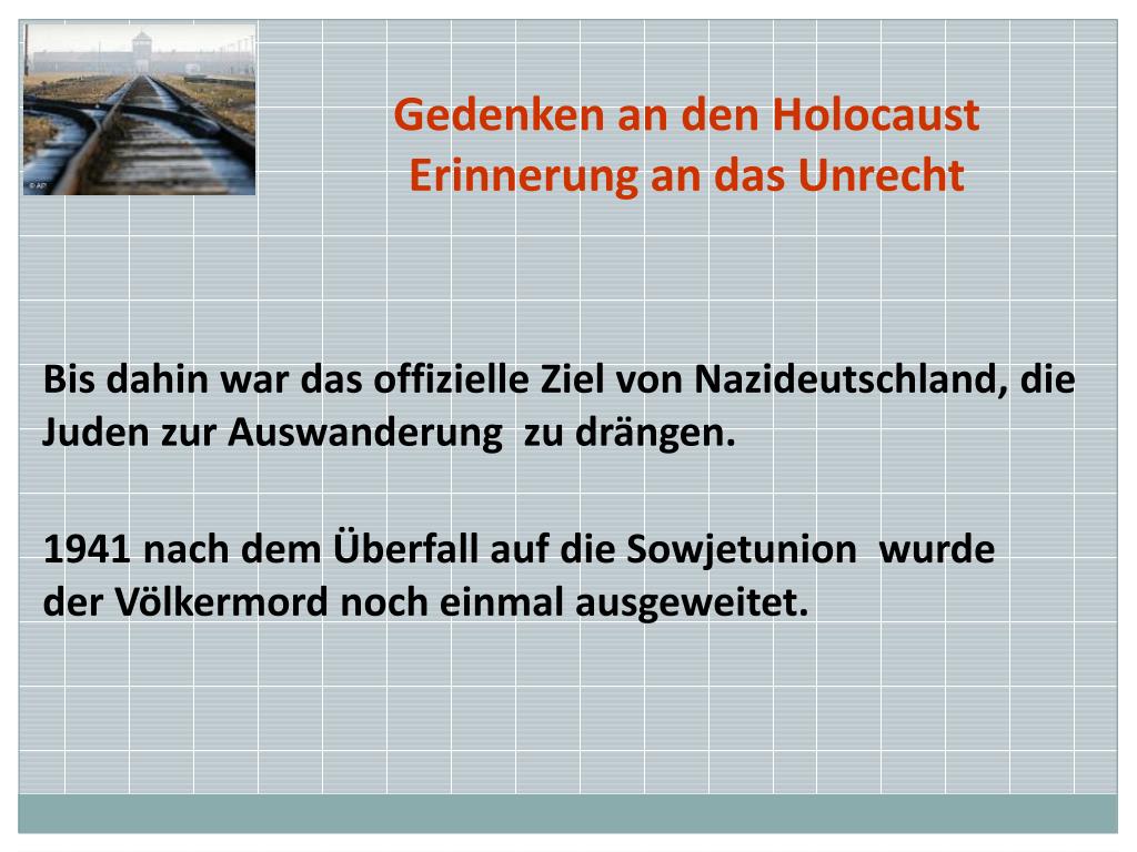 Gedenken an den Holocaust Erinnerung an das Unrecht Bis dahin war das offizielle Ziel von Nazideutschland, die Juden zur Auswanderung zu drängen. 1941 nach dem Überfall auf die Sowjetunion wurde der Völkermord noch einmal ausgeweitet.