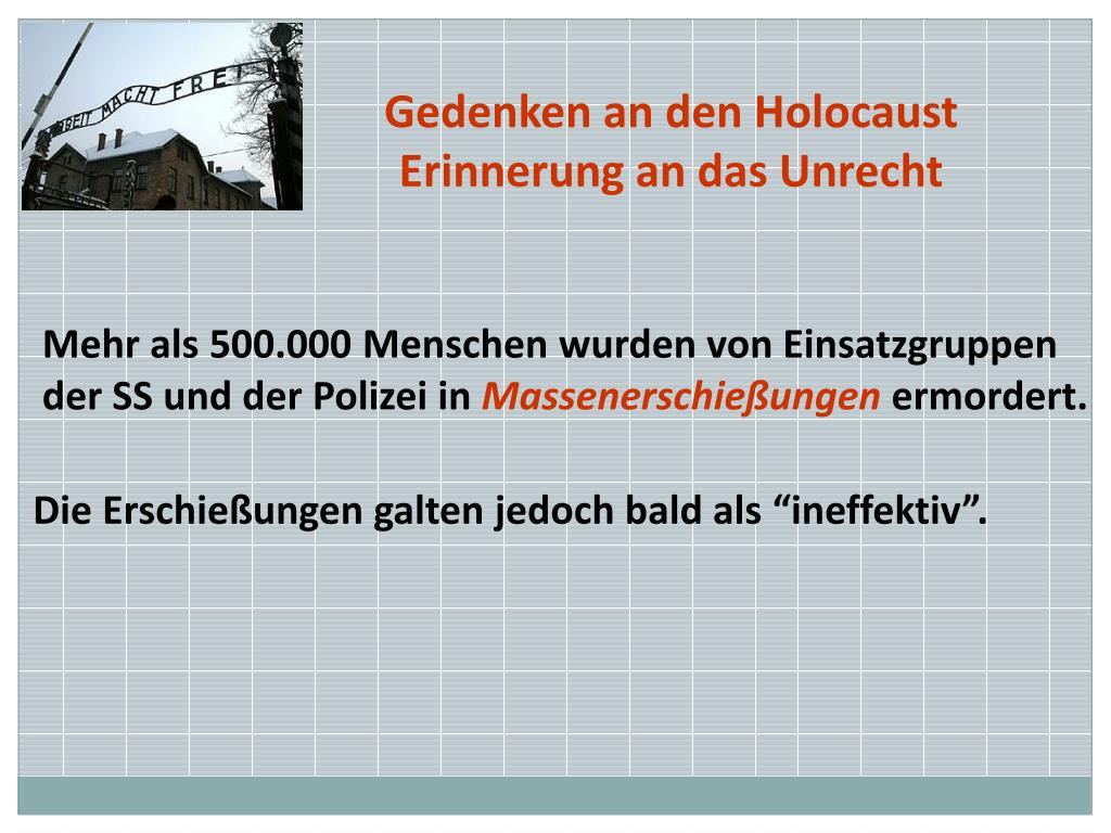 Gedenken an den Holocaust Erinnerung an das Unrecht Mehr als 500.000 Menschen wurden von Einsatzgruppen der SS und der Polizei in Massenerschießungen ermordert. Die Erschießungen galten jedoch bald als “ineffektiv”.