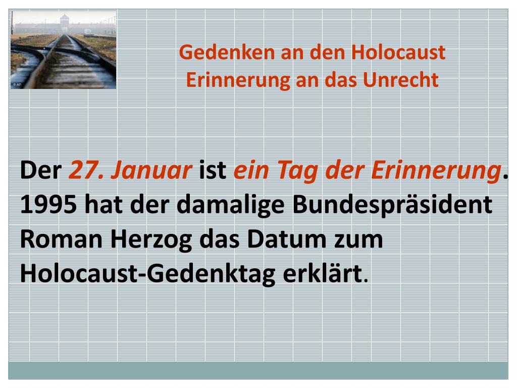 Gedenken an den Holocaust Erinnerung an das Unrecht Der 27. Januar ist ein Tag der Erinnerung. 1995 hat der damalige Bundespräsident Roman Herzog das Datum zum Holocaust-Gedenktag erklärt.