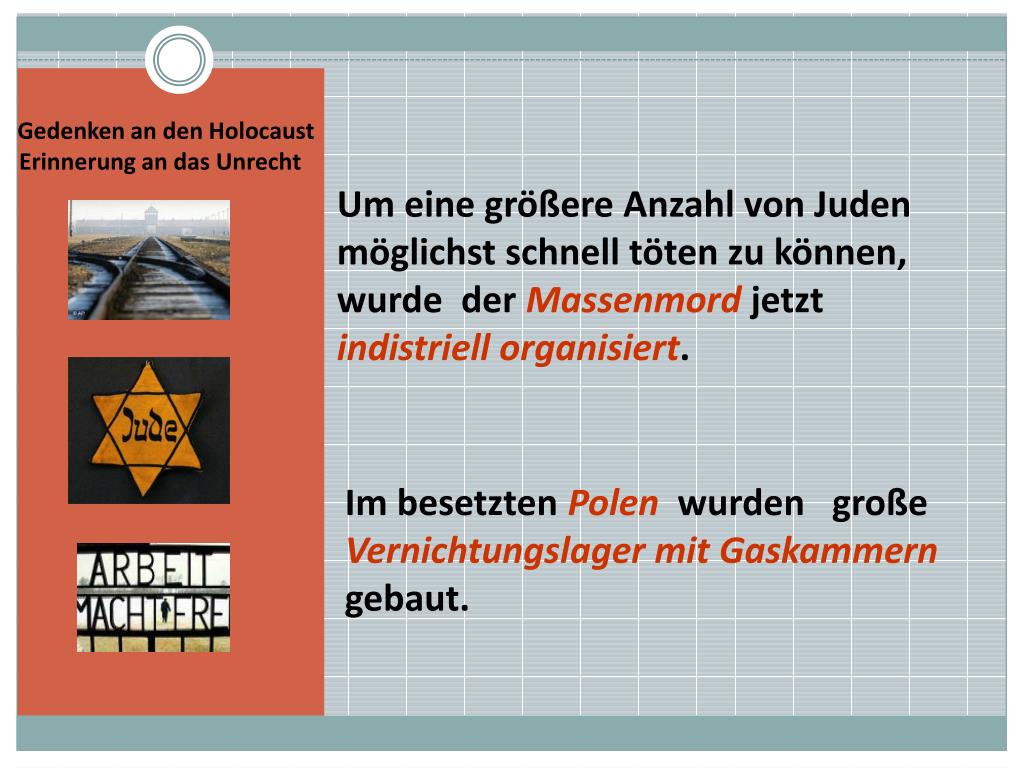 Gedenken an den Holocaust Erinnerung an das Unrecht Um eine größere Anzahl von Juden möglichst schnell töten zu können, wurde der Massenmord jetzt indistriell organisiert. Im besetzten Polen wurden große Vernichtungslager mit Gaskammern gebaut.