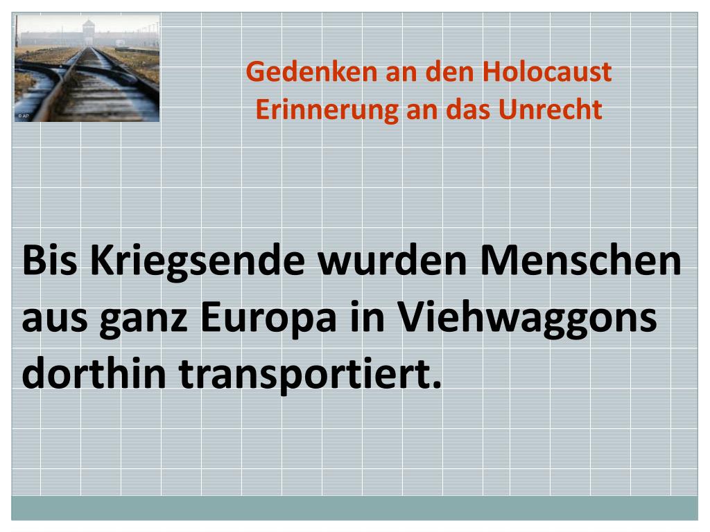 Gedenken an den Holocaust Erinnerung an das Unrecht Bis Kriegsende wurden Menschen aus ganz Europa in Viehwaggons dorthin transportiert.