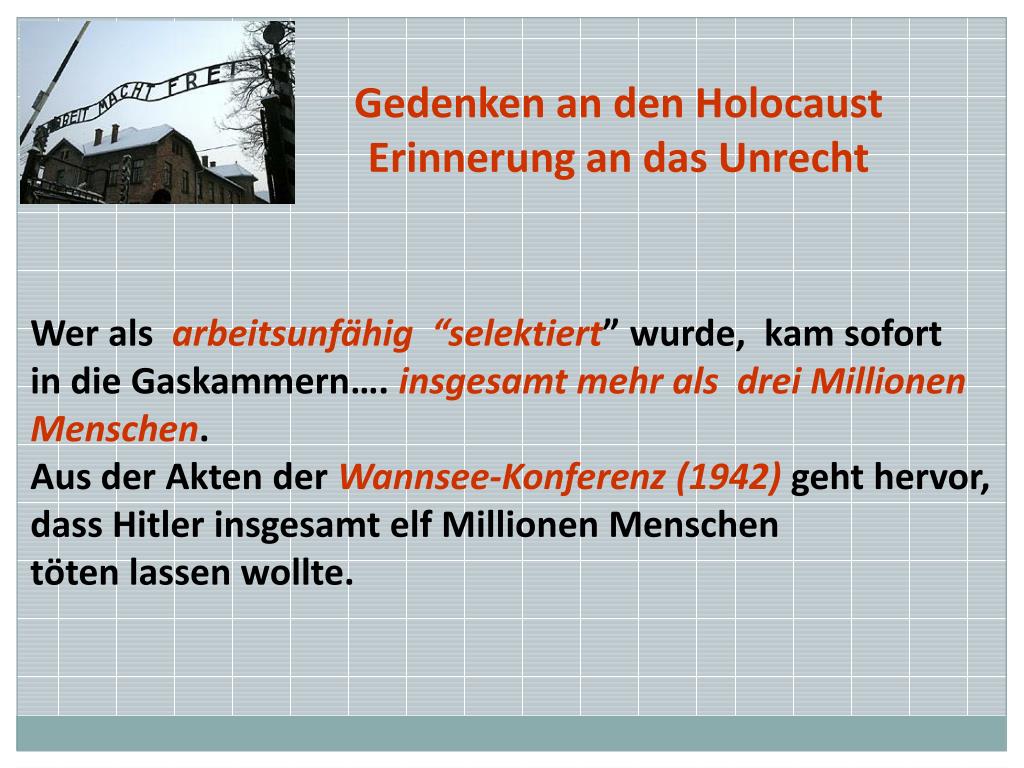 Gedenken an den Holocaust Erinnerung an das Unrecht Wer als arbeitsunfähig “selektiert” wurde, kam sofort in die Gaskammern…. insgesamt mehr als drei Millionen Menschen. Aus der Akten der Wannsee-Konferenz (1942) geht hervor, dass Hitler insgesamt elf Millionen Menschen töten lassen wollte.