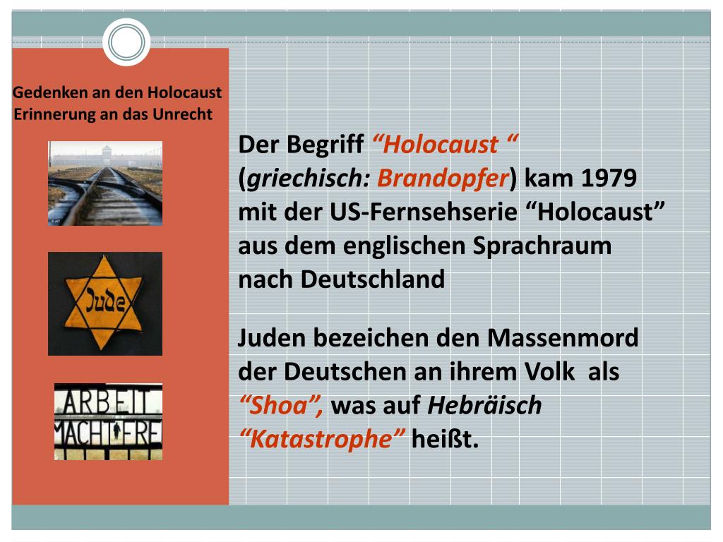 Gedenken an den Holocaust Erinnerung an das Unrecht Der Begriff “Holocaust “ (griechisch: Brandopfer) kam 1979 mit der US-Fernsehserie “Holocaust” aus dem englischen Sprachraum nach Deutschland Juden bezeichen den Massenmord der Deutschen an ihrem Volk als “Shoa”, was auf Hebräisch “Katastrophe”heißt.
