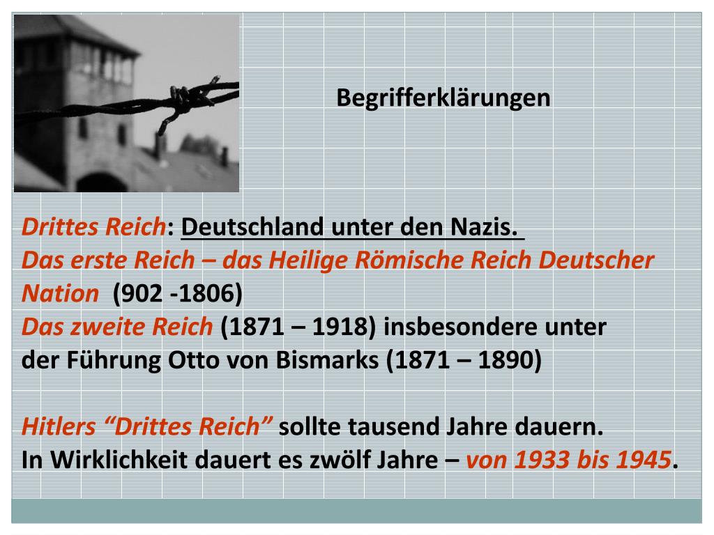Begrifferklärungen Drittes Reich: Deutschland unter den Nazis. Das erste Reich – das Heilige Römische Reich Deutscher Nation (902 -1806) Das zweite Reich (1871 – 1918) insbesondere unter der Führung Otto von Bismarks (1871 – 1890) Hitlers “Drittes Reich” sollte tausend Jahre dauern. In Wirklichkeit dauert es zwölf Jahre – von 1933 bis 1945.
