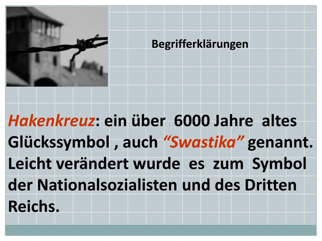 Begrifferklärungen Hakenkreuz: ein über 6000 Jahre altes Glückssymbol , auch “Swastika” genannt. Leicht verändert wurde es zum Symbol der Nationalsozialisten und des Dritten Reichs.