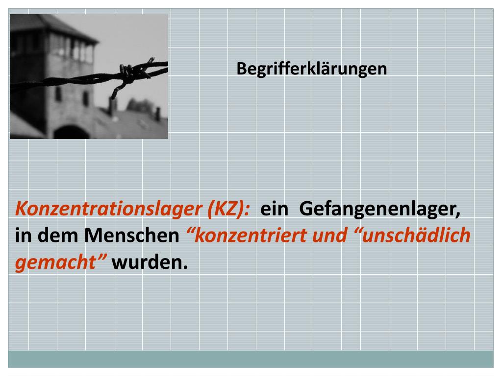 Begrifferklärungen Konzentrationslager (KZ): ein Gefangenenlager, in dem Menschen “konzentriert und “unschädlich gemacht” wurden.
