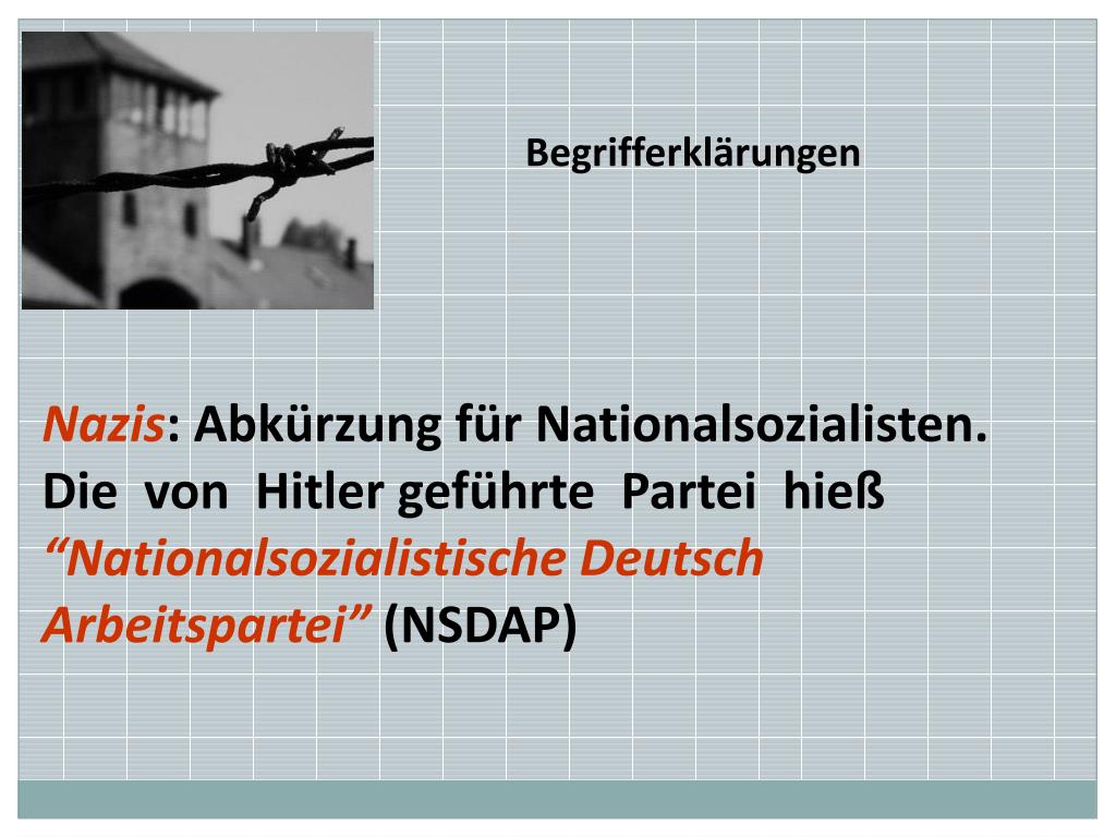 Begrifferklärungen Nazis: Abkürzung für Nationalsozialisten. Die von Hitler geführte Partei hieß “Nationalsozialistische Deutsch Arbeitspartei” (NSDAP)