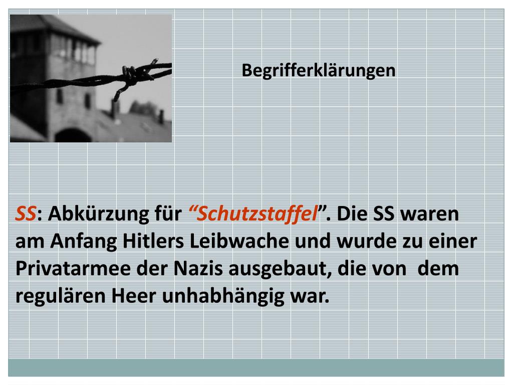 Begrifferklärungen SS: Abkürzung für “Schutzstaffel”. Die SS waren am Anfang Hitlers Leibwache und wurde zu einer Privatarmee der Nazis ausgebaut, die von dem regulären Heer unhabhängig war.