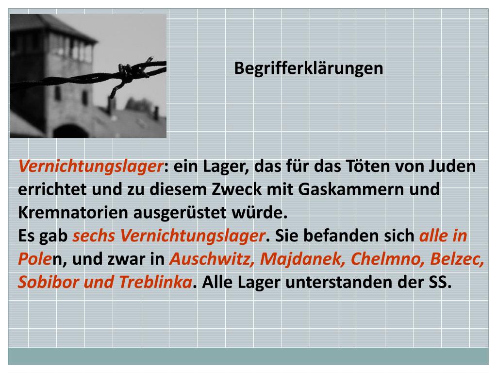 Begrifferklärungen Vernichtungslager: ein Lager, das für das Töten von Juden errichtet und zu diesem Zweck mit Gaskammern und Kremnatorien ausgerüstet würde. Es gab sechs Vernichtungslager. Sie befanden sich alle in Polen, und zwar in Auschwitz, Majdanek, Chelmno, Belzec, Sobibor und Treblinka. Alle Lager unterstanden der SS.
